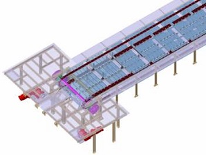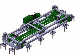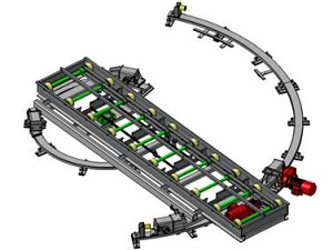 該系統(tǒng)包含的主要輸送機形式有:滾床、轉(zhuǎn)臺、橫移機、橫移鏈、升降機、鏈床、板鏈等等,由于托盤載荷較大,對設(shè)備的承載能力有較高的要求。鏈床主要應(yīng)用于合裝線及相關(guān)托盤儲存線,它運行平穩(wěn)、噪音低、可實現(xiàn)高速運行,尤其適用于自動化程度和精度要求高的合裝線。