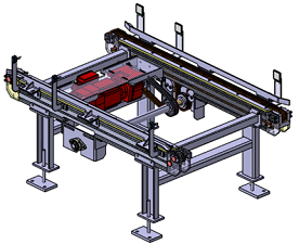 其中RGV小車機(jī)械單元包含RGV小車主體(基礎(chǔ)框架、驅(qū)動(dòng)輪組件、從動(dòng)輪組件、蓋板組件、檢測(cè)開關(guān)組件、防撞塊組件等)以及車載轉(zhuǎn)運(yùn)機(jī)構(gòu)(輸送機(jī)或者伸縮貨叉等);
