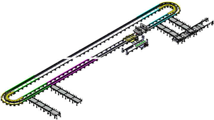 RGV 是一種在固定軌道上進(jìn)行快速移動(dòng)的臺(tái)車,可搭配輸送機(jī)、伸縮貨叉等設(shè)備,在智能控制與調(diào)度系統(tǒng)的指令下,沿著環(huán)形軌道或直線往復(fù)式軌道將物料快速、準(zhǔn)確、靈活地配送到多個(gè)設(shè)定的站臺(tái)。